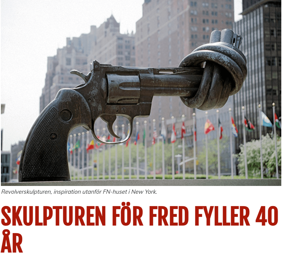 Att sedan Sverige gör allt för att tvätta bort sin inblandning i världens tragedier i långt över 1000 år gör detta konstverk än mer patetiskt. Inte att förglömma är att Sverige räknas som en av världens största vapenexportör sett per capita. Kanske är det då inte förvånande att det blev just en svensk som fick ståta med detta konstverk utanför FN huset? Som President Trump sa – Vad har FN för syfte egentligen?